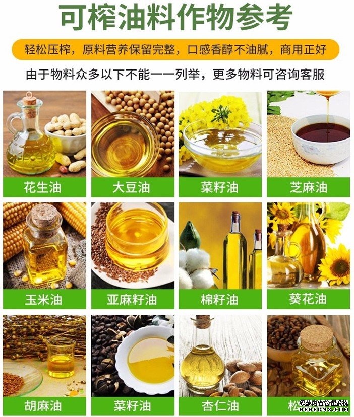 該設(shè)備可適用于菜籽、花生、茶籽、大豆、核桃、葵花籽等油料的生產(chǎn)加工,且壓榨出的油品綠色環(huán)保,對人體健康有益無害。購買此機(jī)后可長期穩(wěn)定作業(yè),對于中、小油廠和鄉(xiāng)鎮(zhèn)個體企業(yè)都很適用。